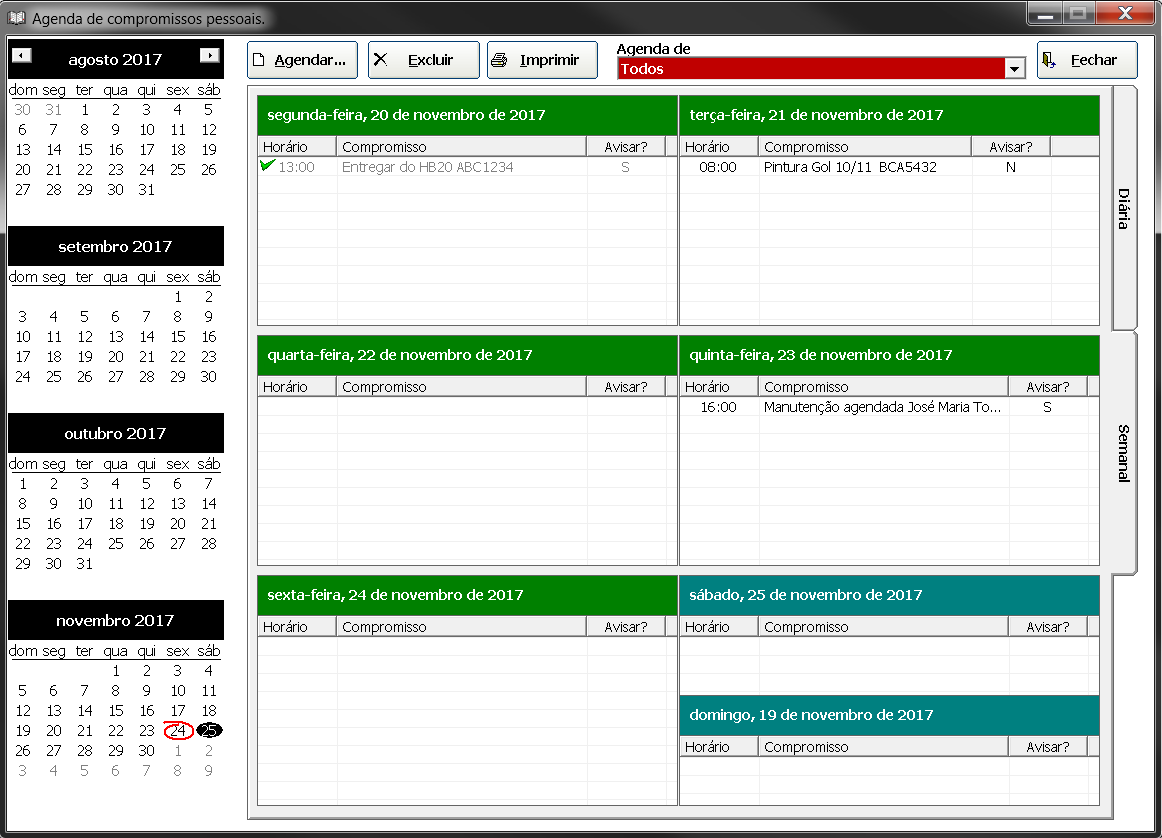 O módulo de agenda lhe auxilia a manter seus compromissos em dia, possibilitando agendar manutenções e revisões futuras, alertando quanto ao fim de prazos.
