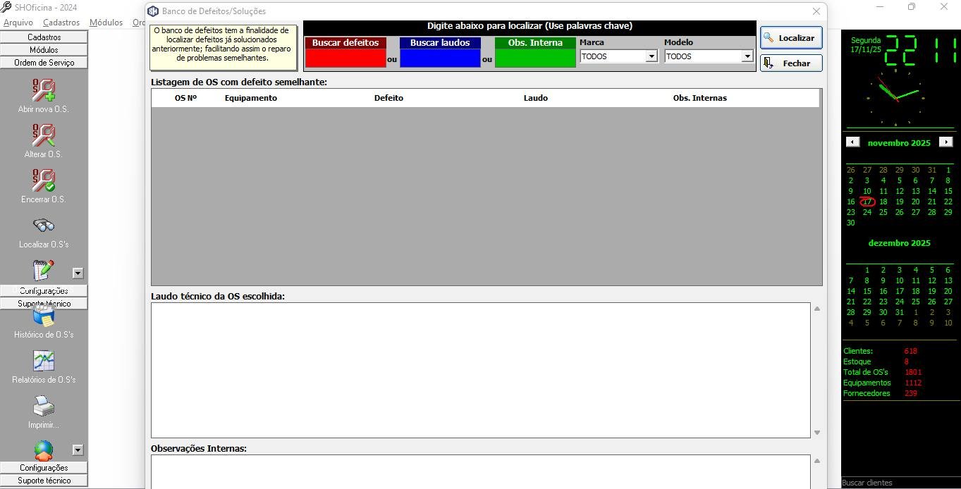 É possível trabalhar com garantia interna, garantia de fabricantes ou com garantidores (Garantia estendida). Todas as OS (aprovadas, concretizadas ou não) ficam armazenadas em nosso sistema, permitindo obter um completo histórico por equipamento/veículo ou por cliente.